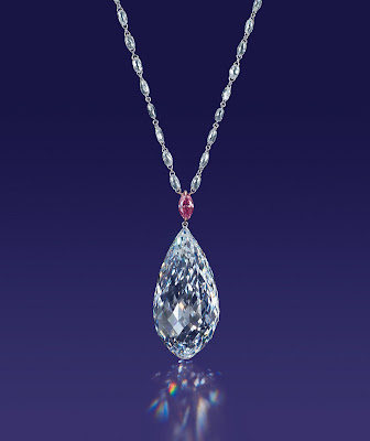 The briolette has been graded as D color and type IIa, indicating its internally flawless clarity, excellent polish, highest level of chemical purity and exceptional optical transparency. The two diamonds are joined to a briolette diamond neck chain mounted in 18k rose and white gold. The necklace is estimated to fetch $8.5 to $12.5 million.